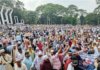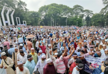 দুর্ঘটনায় ক্ষতিগ্রস্ত বাসের পাশে ফায়ার সার্ভিসের সদস্যরা। গতকাল রাতে
