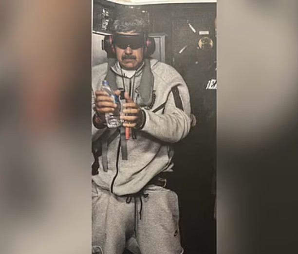 ছবিতে দেখা যায়, ধূসর রঙের পোশাক পরা মাদুরো হাতে একটি পানির বোতল নিয়ে দাঁড়িয়ে আছেন।