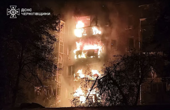 রাশিয়ার হামলায় জ্বলছে একটি ভবন। বুধবার রাতে ইউক্রেনের চেরনিহিভ অঞ্চলে, ছবি: রয়টার্স