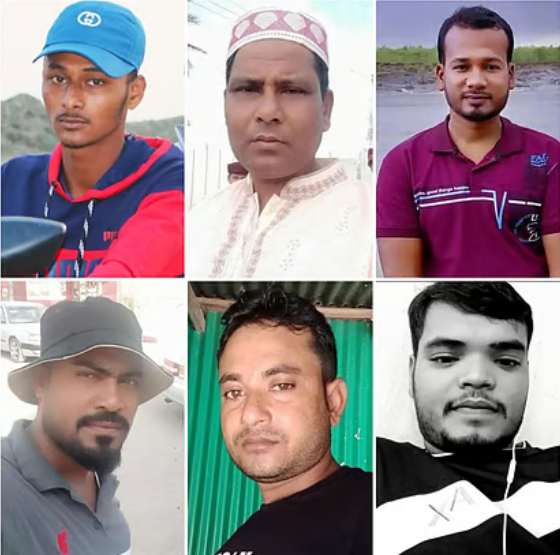 ওমানে সড়ক দুর্ঘটনায় নিহত ওপরে বাঁ থেকে মো. জুয়েল, আমিন মাঝি ও মো. সাহাবুদ্দিন। নিচে বাঁ থেকে মো. রনি, মো .বাবলু ও মো. রকি, ছবি: পরিবারের সৌজন্যে