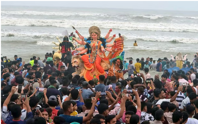 কক্সবাজার সমুদ্রসৈকতে উৎসবমুখর পরিবেশে প্রতিমা বিসর্জন দেওয়া হয়। আজ বিকেলে