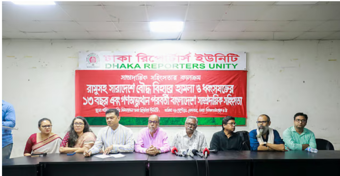 ‘সাম্প্রদায়িক সহিংসতার কালক্রম: রামুসহ সারা দেশে বৌদ্ধ বিহারে হামলা ও ধ্বংসযজ্ঞের ১৩ বছর এবং গণ-অভ্যুত্থানপরবর্তী বাংলাদেশে সাম্প্রদায়িক সহিংসতা’ শীর্ষক আলোচনা সভায় উপস্থিত অতিথিরা। আজ সোমবার ঢাকা রিপোর্টার্স ইউনিটিতে