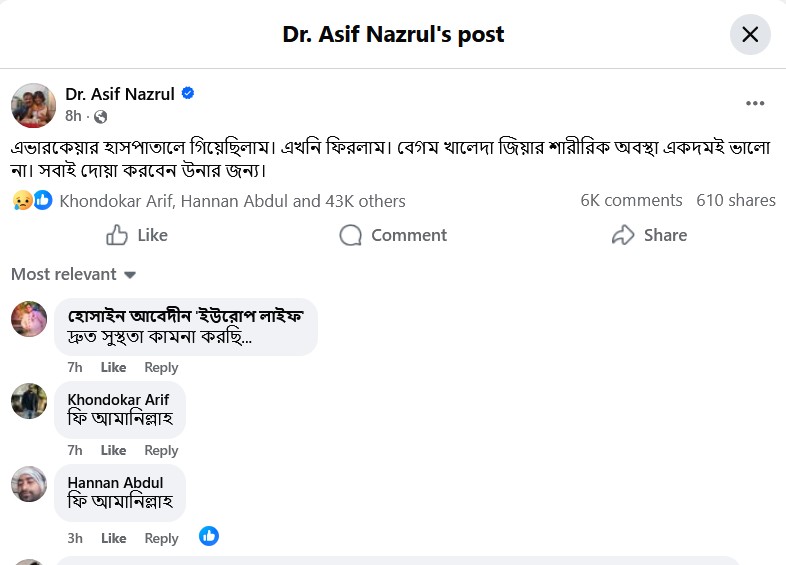 ফেসবুক স্ট্যাটাসে আইন উপদেষ্টা আসিফ নজরুল লিখেছেন, এভারকেয়ার হাসপাতালে গিয়েছিলাম। এখনি ফিরলাম। বেগম খালেদা জিয়ার শারীরিক অবস্থা একদমই ভালো না। সবাই দোয়া করবেন উনার জন্য।