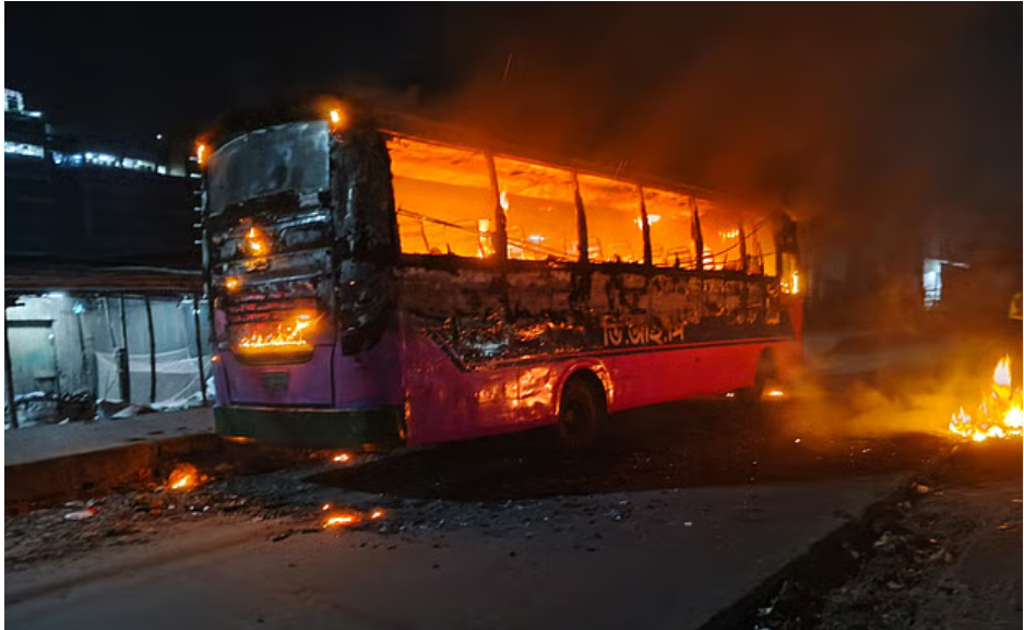 ঢাকা-টাঙ্গাইল মহাসড়কের পাশে দাঁড়িয়ে থাকা একটি বাসে অগ্নিসংযোগ করেছে দুর্বৃত্তরা। আজ বুধবার ভোরে গাজীপুর নগরের ভোগড়া পেয়ারাবাগান এলাকায়, ছবি : সংগৃহীত