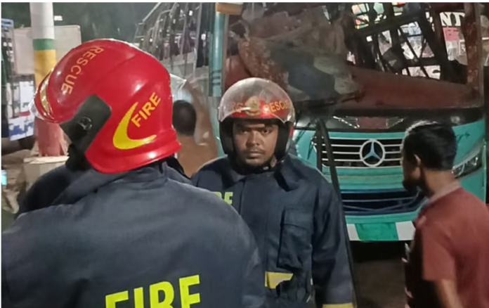 দুর্ঘটনায় ক্ষতিগ্রস্ত বাসের পাশে ফায়ার সার্ভিসের সদস্যরা। গতকাল রাতে