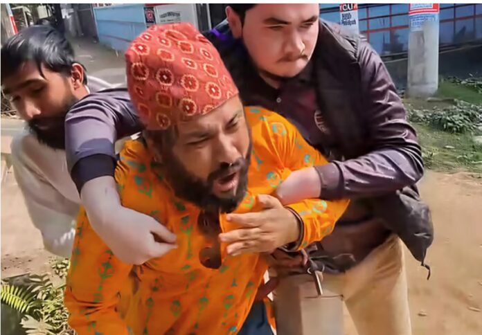 চট্টগ্রাম বিশ্ববিদ্যালয়ের আইন বিভাগের সহকারী অধ্যাপক হাসান মোহাম্মদকে টেনে–হিঁচড়ে নিয়ে যাচ্ছেন চাকসুর দপ্তর সম্পাদক আব্দুল্লাহ আল মামুন, ছবি: ভিডিও থেকে পাওয়া।