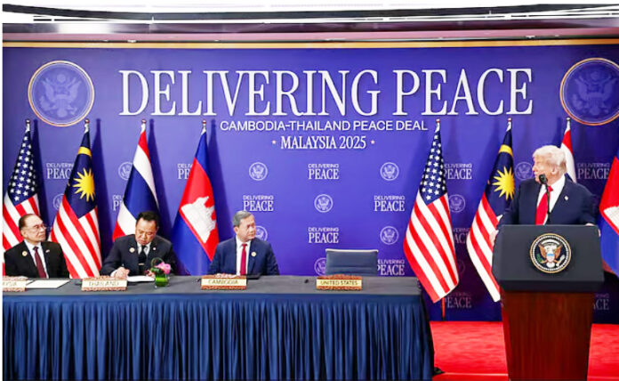 আসিয়ান সভাপতি হিসেবে মালয়েশিয়ার প্রধানমন্ত্রী আনোয়ার ইব্রাহিম ও মার্কিন প্রেসিডেন্ট ডোনাল্ড ট্রাম্প চুক্তি স্বাক্ষর প্রত্যক্ষ করেছেন।