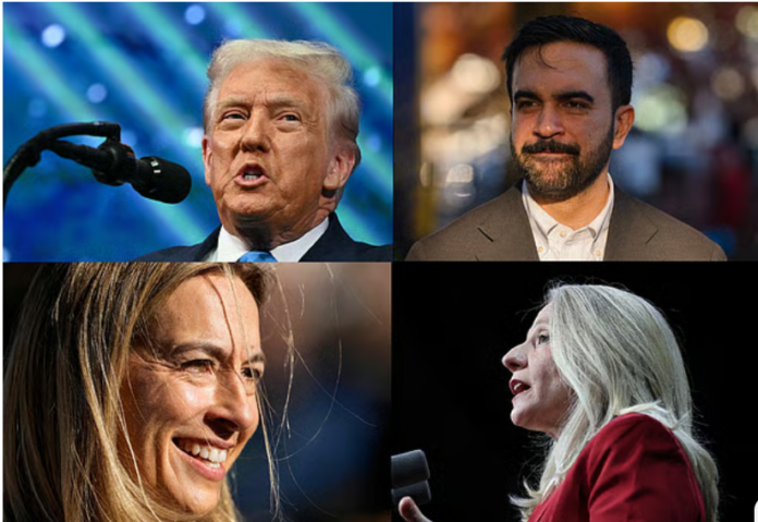 ডোনাল্ড ট্রাম্প (ওপরে বাঁয়ে), জোহরান মামদানি (ওপরে ডানে), মাইকি শেরিল (নিচে বাঁয়ে) ও এবিগেইল স্প্যানবার্গার (নিচে ডানে), ছবি: এএফপি