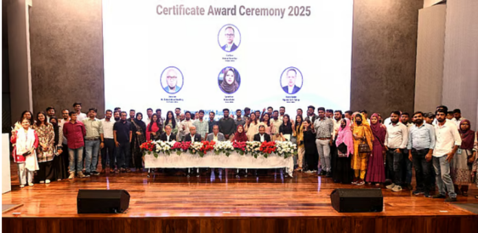 সনদ পাওয়া প্রশিক্ষনার্থীদের সঙ্গে বিজিএমইএর সভাপতি মাহমুদ হাসান খানসহ অন্যরা। গতকাল উত্তরায় বিজিএমইএর কার্যালয়ে।ছবি: বিজিএমইএর সৌজন্যে