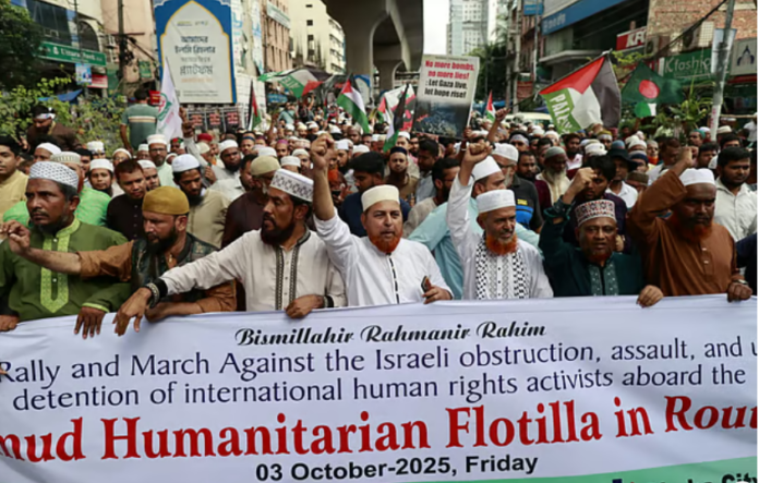 জরুরি ত্রাণসহায়তা নিয়ে গাজা অভিমুখে যাওয়ার পথে ‘গ্লোবাল সুমুদ ফ্লোটিলা’র গ্রেপ্তার করা ক্রু এবং নৌবহরটিতে থাকা মানবাধিকারকর্মীদের মুক্তির দাবি জানিয়েছেন বাংলাদেশ জামায়াতে ইসলামীর সহকারী সেক্রেটারি জেনারেল রফিকুল ইসলাম খান। একই সঙ্গে তিনি ফিলিস্তিনে জাতিগত হত্যার দায়ে ইসরায়েলের প্রধানমন্ত্রী বেনিয়ামিন নেতানিয়াহুকে গ্রেপ্তার করার দাবি জানান।