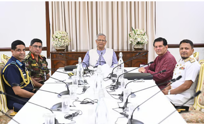 আজ শনিবার সন্ধ্যা সাতটায় সেনাবাহিনীর প্রধান জেনারেল ওয়াকার-উজ-জামান, নৌবাহিনীর প্রধান অ্যাডমিরাল মোহাম্মদ নাজমুল হাসান, বিমানবাহিনীর প্রধান এয়ার চিফ মার্শাল হাসান মাহমুদ খাঁন রাষ্ট্রীয় অতিথি ভবন যমুনায় প্রধান উপদেষ্টার সঙ্গে সাক্ষাৎ করেন। এ সময় জাতীয় নিরাপত্তা উপদেষ্টা খলিলুর রহমান উপস্থিত ছিলেন। পরে প্রধান উপদেষ্টার প্রেস উইং সংবাদ বিজ্ঞপ্তি দিয়ে এসব তথ্য জানায়।
