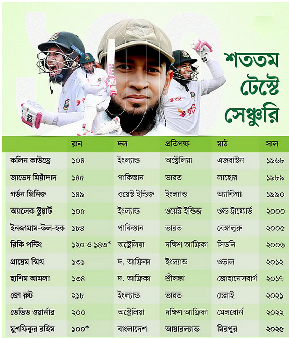 বিশ্বের ১১তম ক্রিকেটার হিসেবে এই কীর্তি গড়েছেন মুশফিক। টেস্টে শততম ম্যাচে সেঞ্চুরির এটি ১২তম ঘটনা। কিংবদন্তি রিকি পন্টিং তাঁর শততম টেস্টে জোড়া সেঞ্চুরি করেছিলেন।