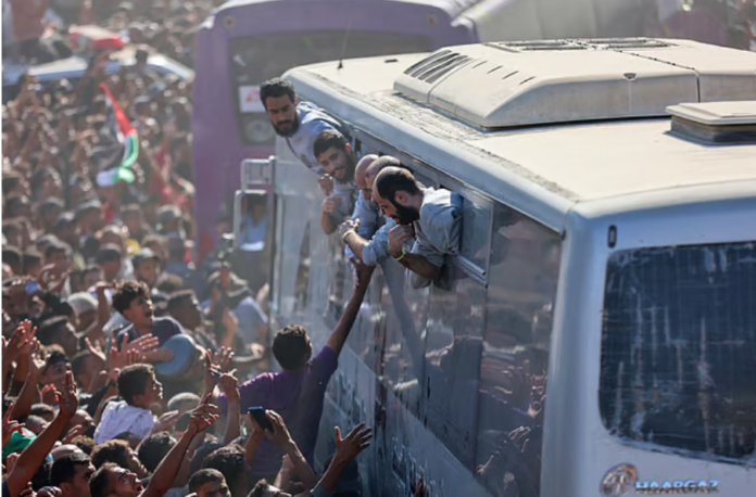 ইসরায়েলের কারাগার থেকে মুক্ত ফিলিস্তিনিদের বাসে করে নেওয়া হচ্ছে। এ সময় হাজার হাজার ফিলিস্তিনি তাঁদের স্বাগত জানান। ১৩ অক্টোবর ২০২৫, খান ইউনিসে নাসের হাসপাতালের বাইরে, ছবি: এএফপি