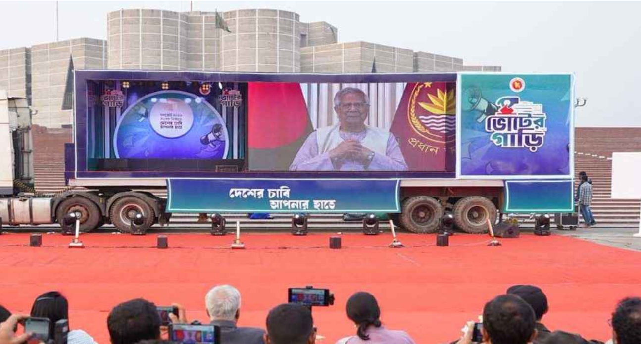 ত্রয়োদশ সংসদ নির্বাচন ও জুলাই জাতীয় সনদের বিষয়ে গণভোটের বিষয়ে সারাদেশে প্রচারণার লক্ষ্যে যাত্রা শুরু করেছে দশটি ভোটের গাড়ি— ‘সুপার ক্যারাভান’।