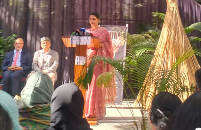 ধানমন্ডির আলিয়ঁস ফ্রঁসেজে ‘দ্য সোল অব জুট’ নামে এক প্রদর্শনীর উদ্বোধন অনুষ্ঠানে বক্তব্য দেন পরিবেশ, বন ও জলবায়ু পরিবর্তন এবং পানিসম্পদ মন্ত্রণালয়ের উপদেষ্টা সৈয়দা রিজওয়ানা হাসান