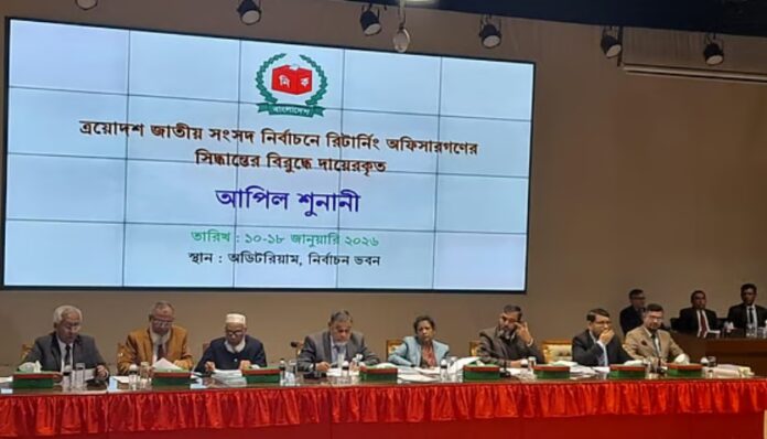 ত্রয়োদশ জাতীয় সংসদ নির্বাচনে রিটার্নিং অফিসারদের সিদ্ধান্তের বিরুদ্ধে নির্বাচন কমিশনে (ইসি) আপিল শুনানি শুরু হয়েছে। এতে অংশ নিয়েছেন স্থানীয় পর্যায়ে মনোনয়ন বাতিলের বিরুদ্ধে আপিল করা প্রার্থী ও তাঁদের প্রতিনিধিরা। আজ শনিবার সকাল ১০টা থেকে শুরু হওয়া এ শুনানি বিকেল ৫টা পর্যন্ত চলবে। রাজধানীর আগারগাঁওয়ে নির্বাচন কমিশন কার্যালয়ে এ শুনানি হচ্ছে।