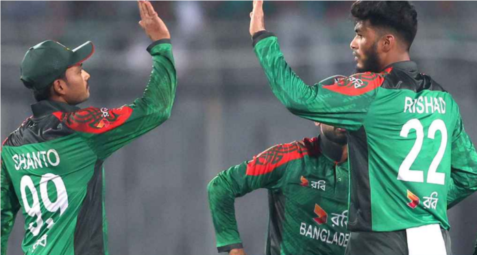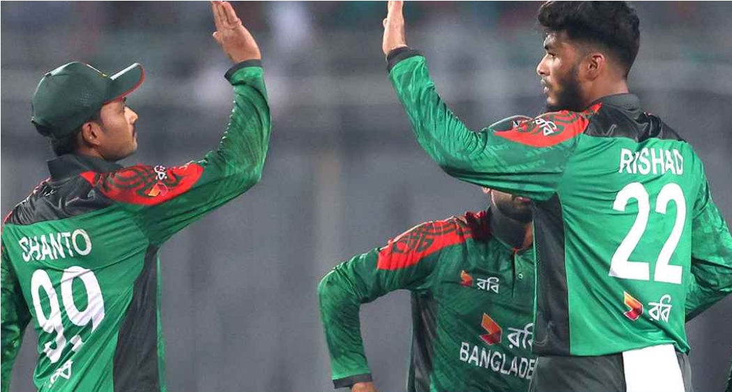 এর আগে ব্যাটিংয়ে শুরুটা হতাশাজনক ছিল বাংলাদেশের। ৮ রানের মধ্যে দুই ওপেনার সাইফ হাসান ও সৌম্য সরকার বিদায় নেন। এরপর শান্ত ও হৃদয়ের ৭১ রানের জুটি দলকে সাময়িকভাবে টানলেও মিডল অর্ডারে নিয়মিত উইকেট পতন থামাতে পারেনি টাইগাররা। তবে শেষদিকে রিশাদের ঝড়ো ইনিংস দলকে লড়াইয়ের পুঁজি দেয়।