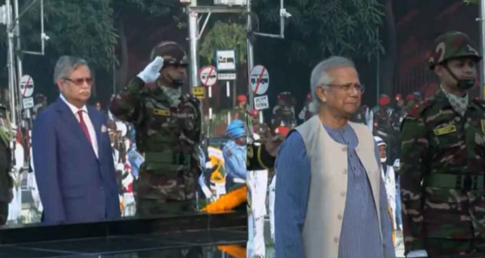 সশস্ত্র বাহিনী দিবসে শিখা অনির্বাণে পুষ্পস্তবক অর্পণ করে মুক্তিযুদ্ধে শহীদদের শ্রদ্ধা জানিয়েছেন রাষ্ট্রপতি মো. সাহাবুদ্দিন ও প্রধান উপদেষ্টা ড. মুহাম্মদ ইউনূস।