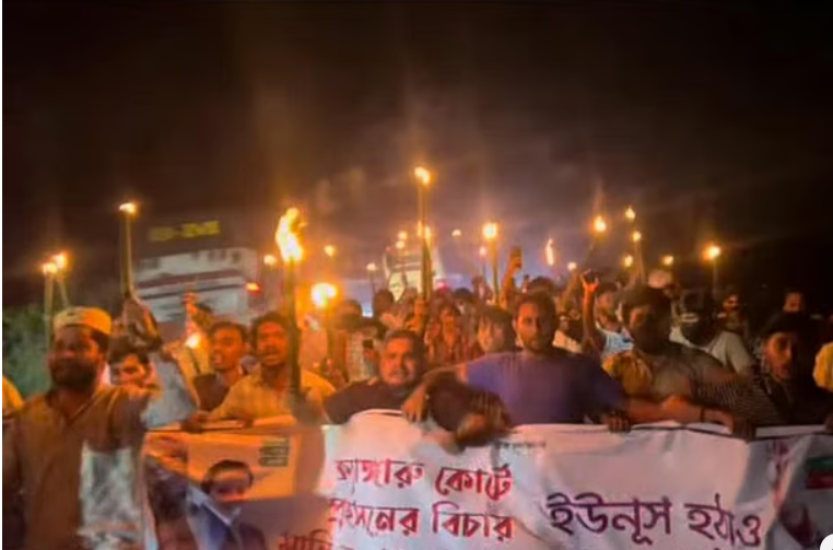 ভিডিওতে আরও দেখা যায়, যে ব্যানার ধরে ছাত্রলীগের নেতা-কর্মীরা মশালমিছিল করেন, সেখানে সিলেট জেলা ছাত্রলীগের সাধারণ সম্পাদক রাহেল সিরাজের নাম লেখা। ব্যানারে ‘হটাও ইউনূস বাঁচাও দেশ’ লেখা ছিল। এ ছাড়া ‘ক্যাঙ্গারু কোর্টে প্রহসনের বিচার মানি না, মানবো না’ লেখা ব্যানারও ছিল।