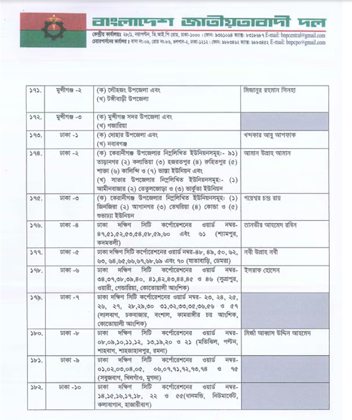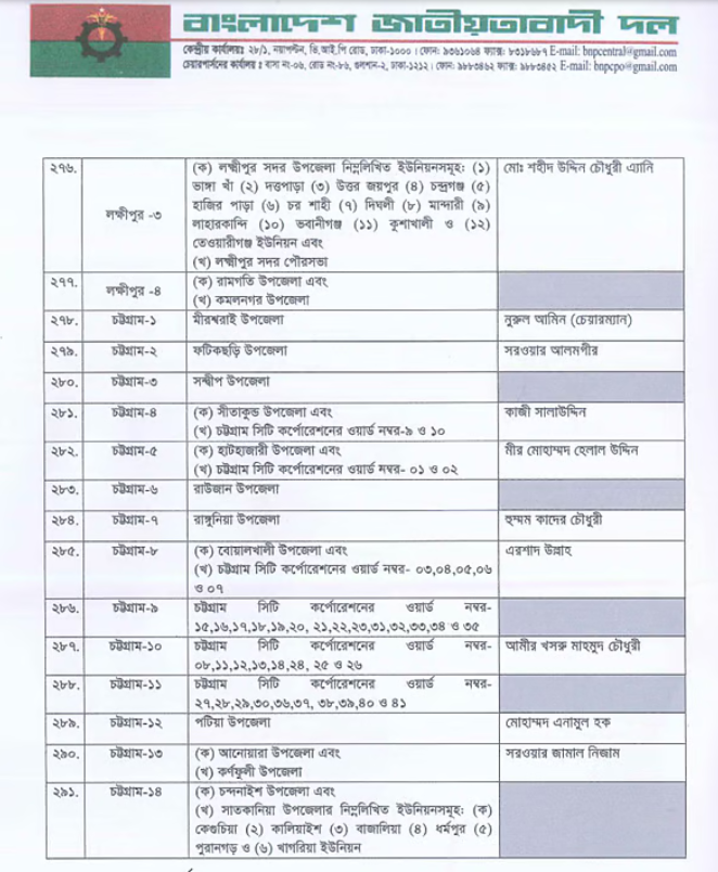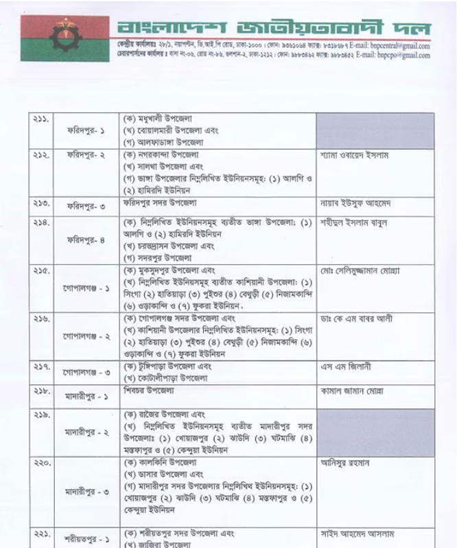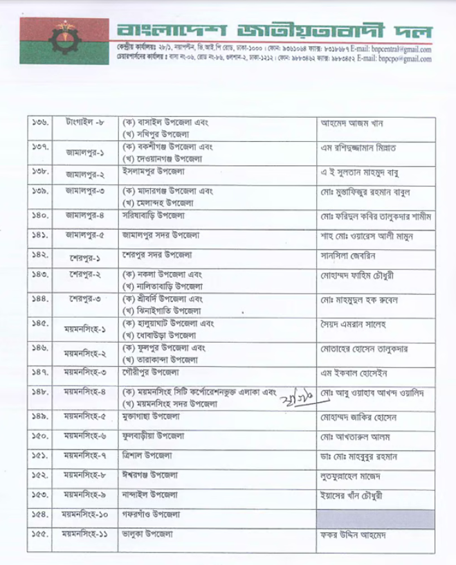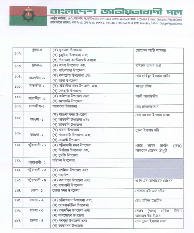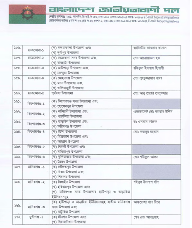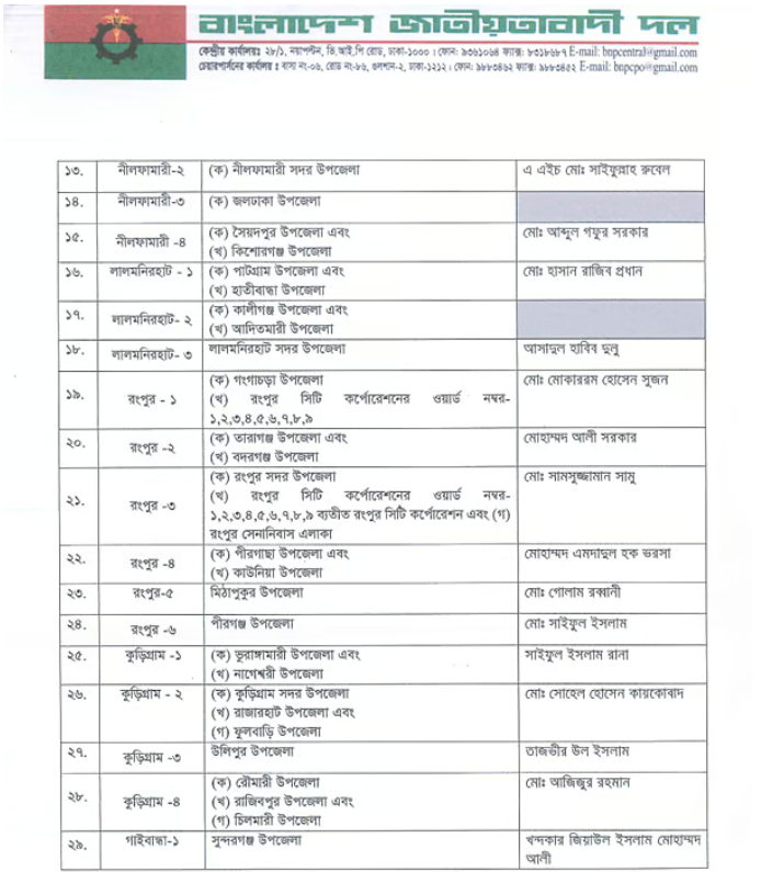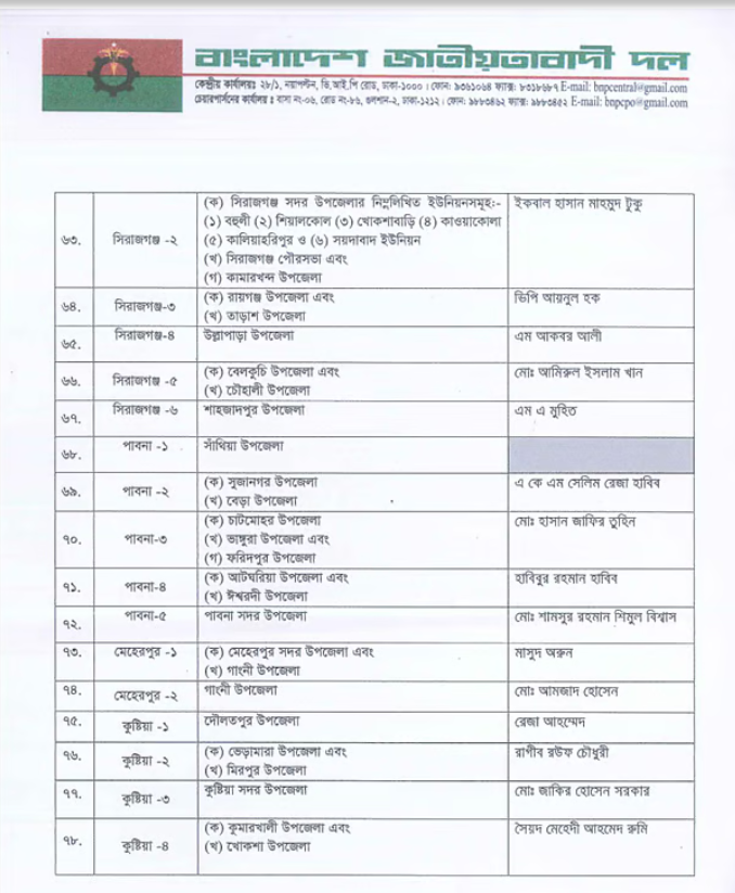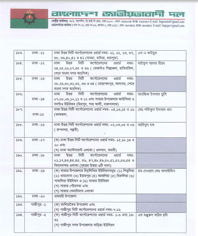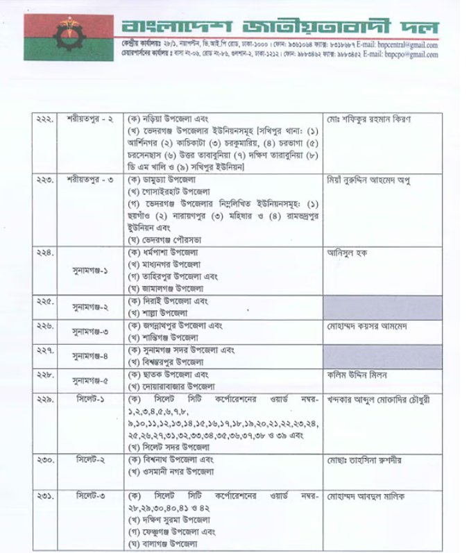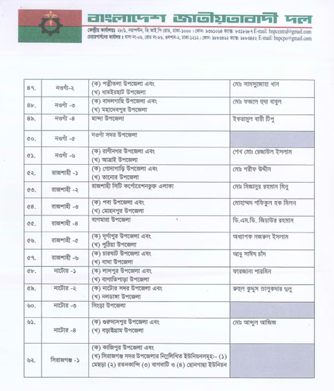 বিএনপির প্রার্থীর তালিকা নিচে তুলে ধরা হলো–