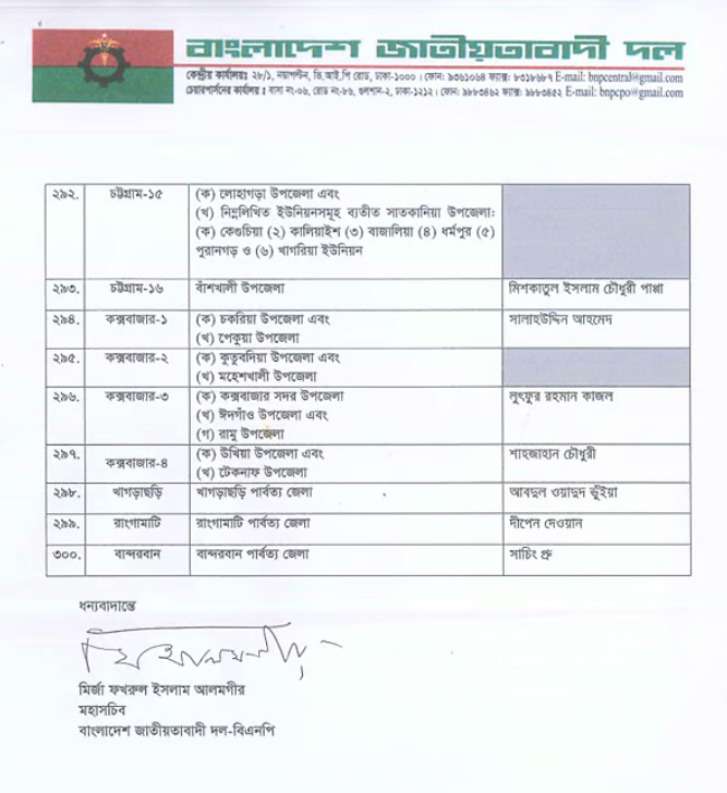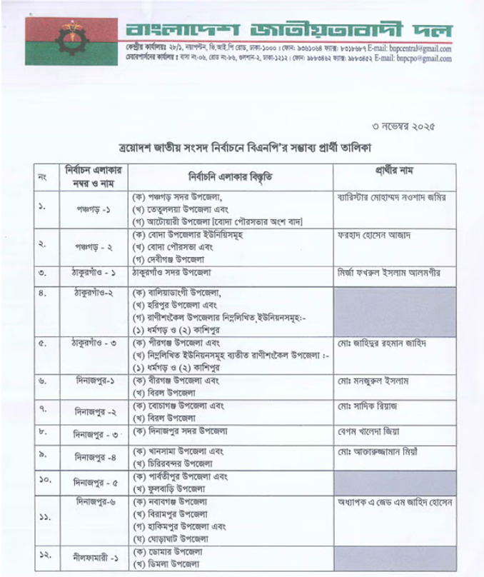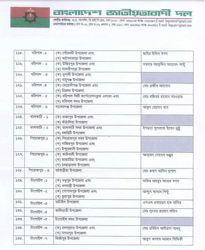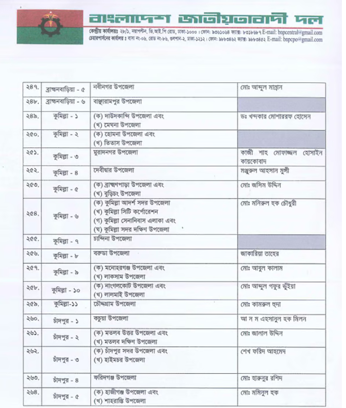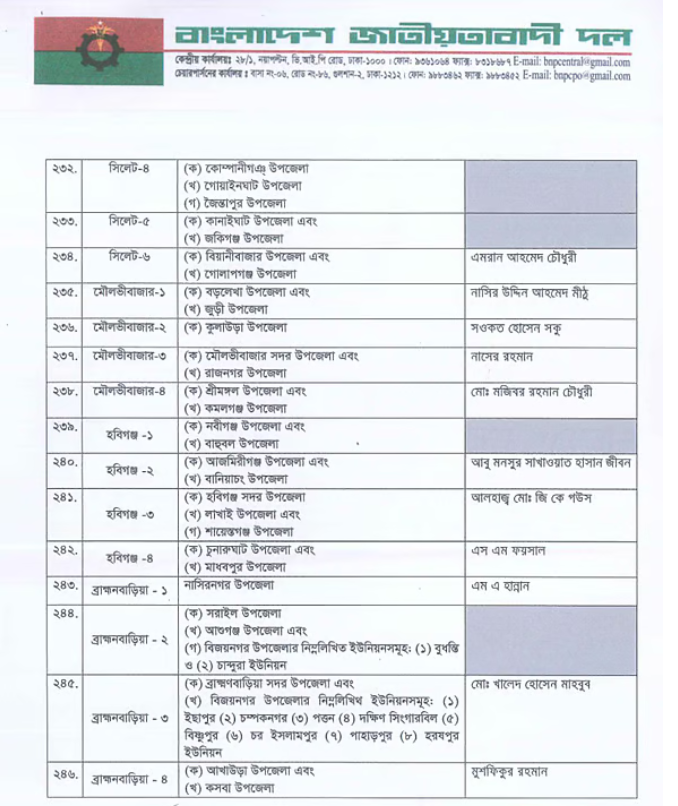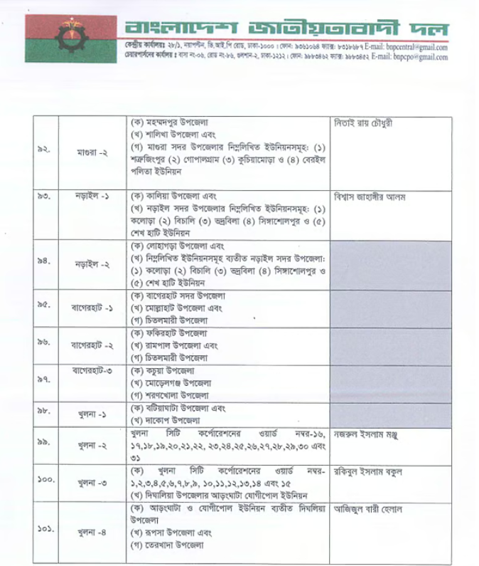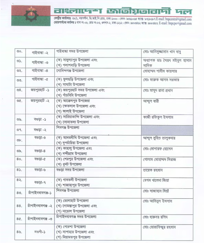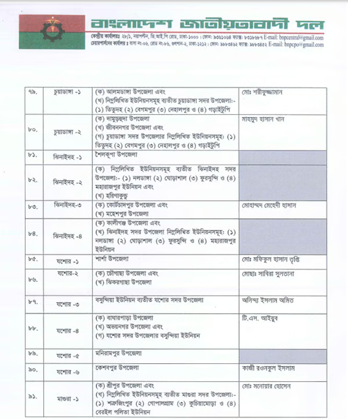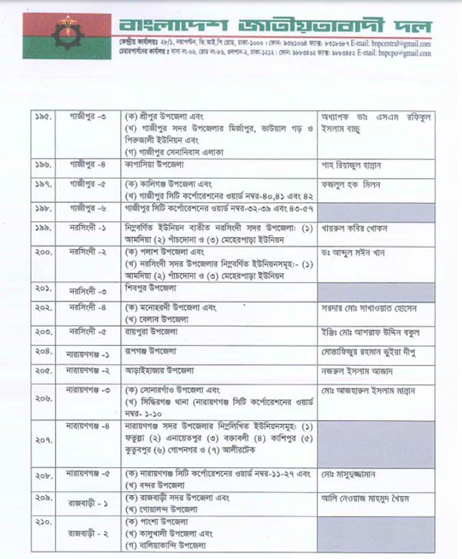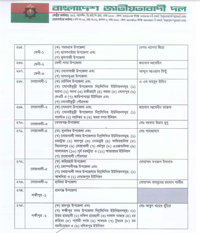 বিএনপির প্রার্থীর তালিকা নিচে তুলে ধরা হলো–