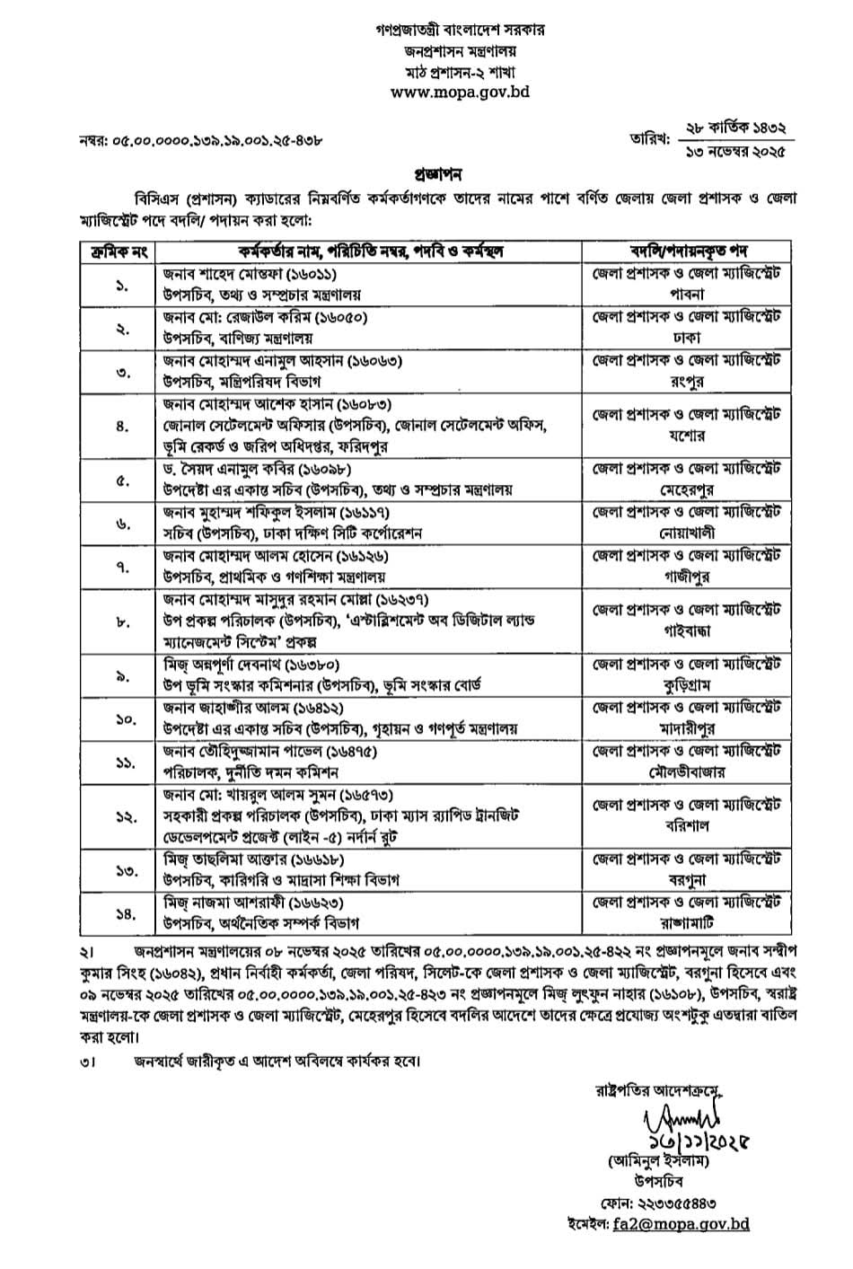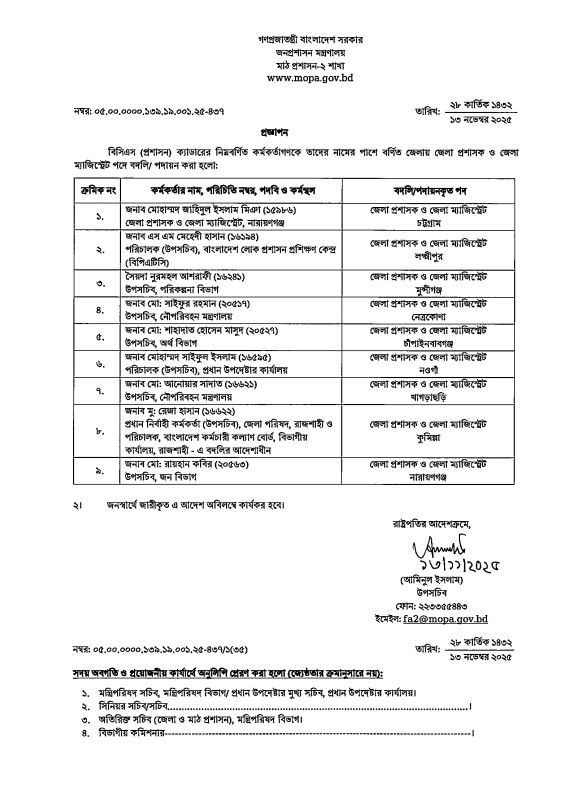 আজকের সিদ্ধান্ত অনুযায়ী নারায়ণগঞ্জের ডিসি মোহাম্মদ জাহিদুল ইসলাম মিঞাকে চট্টগ্রামের ডিসি, বাংলাদেশ লোকপ্রশাসন প্রশিক্ষণ কেন্দ্রের পরিচালক এস এম মেহেদী হাসানকে লক্ষ্মীপুর, পরিকল্পনা বিভাগের উপসচিব সৈয়দা নুরমহল আশরাফীকে মুন্সিগঞ্জ, নৌপরিবহন মন্ত্রণালয়ের উপসচিব মো. সাইফুর রহমানকে নেত্রকোনা, অর্থ বিভাগের উপসচিব মো. শাহাদাত হোসেন মাসুদকে চাঁপাইনবাবগঞ্জ, প্রধান উপদেষ্টার কার্যালয়ের পরিচালক মোহাম্মদ সাইফুল ইসলামকে নওগাঁ, নৌপরিবহন মন্ত্রণালয়ের উপসচিব মো. আনোয়ার সাদাতকে খাগড়াছড়ি, রাজশাহী জেলা পরিষদের প্রধান নির্বাহী কর্মকর্তা মু. রেজা হাসানকে কুমিল্লা এবং জনবিভাগের উপসচিব মো. রায়হান কবিরকে নারায়ণগঞ্জের ডিসি হিসেবে নিয়োগ দেওয়া হয়েছে।