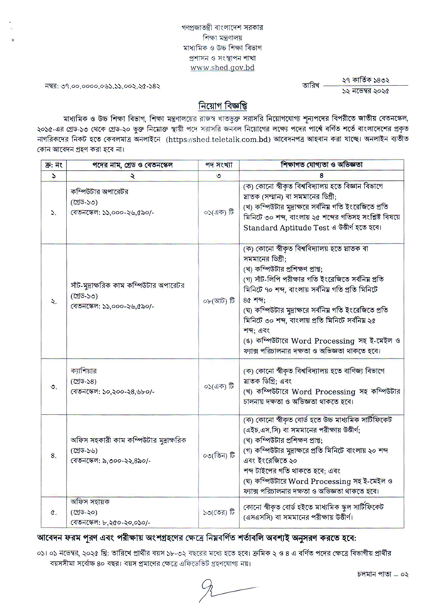 শিক্ষা মন্ত্রণালয়ের মাধ্যমিক ও উচ্চশিক্ষা বিভাগে ১৩ থেকে ২০তম গ্রেডে ২৬টি পদে জনবল নিয়োগ দেওয়া হবে। আবেদন করতে হবে অনলাইনে। আবেদনপ্রক্রিয়া শুরু হবে ১৬ নভেম্বর থেকে; চলবে ৬ ডিসেম্বর পর্যন্ত।