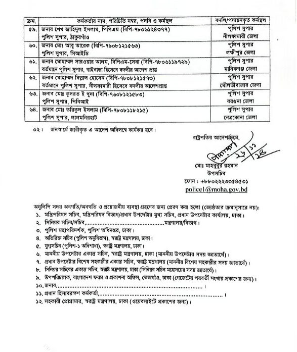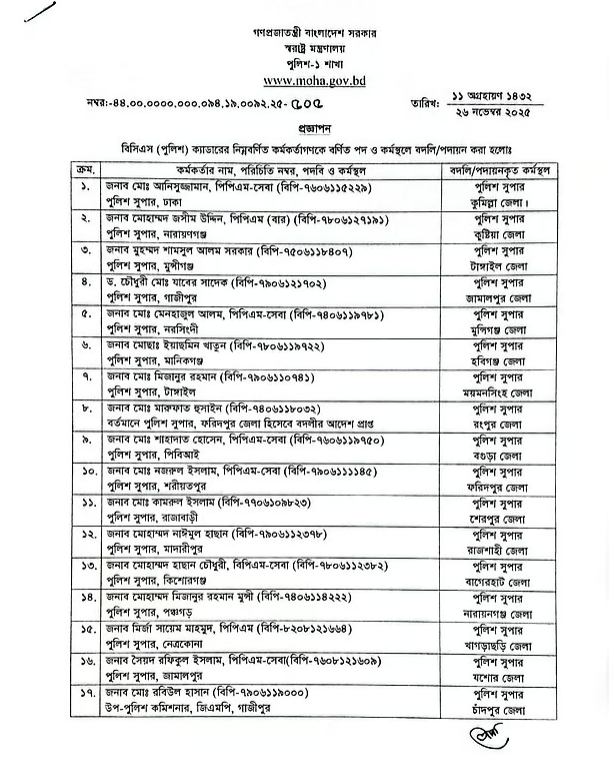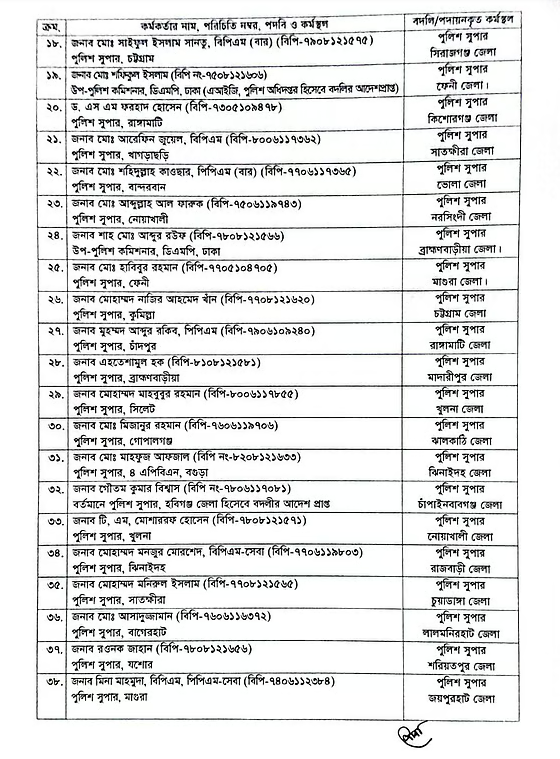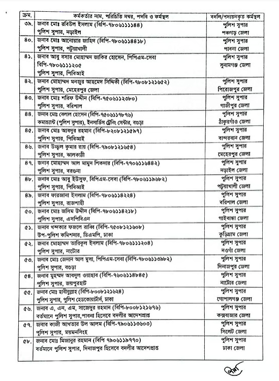 এতে বলা হয়, বিসিএস (পুলিশ) ক্যাডারের বর্ণিত কর্মকর্তাদের বর্ণিত পদ ও কর্মস্থলে বদলি বা পদায়ন করা হলো। জনস্বার্থে জারি করা এ আদেশ অবিলম্বে কার্যকর হবে বলেও প্রজ্ঞাপনে উল্লেখ রয়েছে।